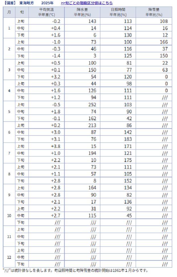 東海地方 月ごとの気象情報(気象庁) 年・月ごとの階級区分値